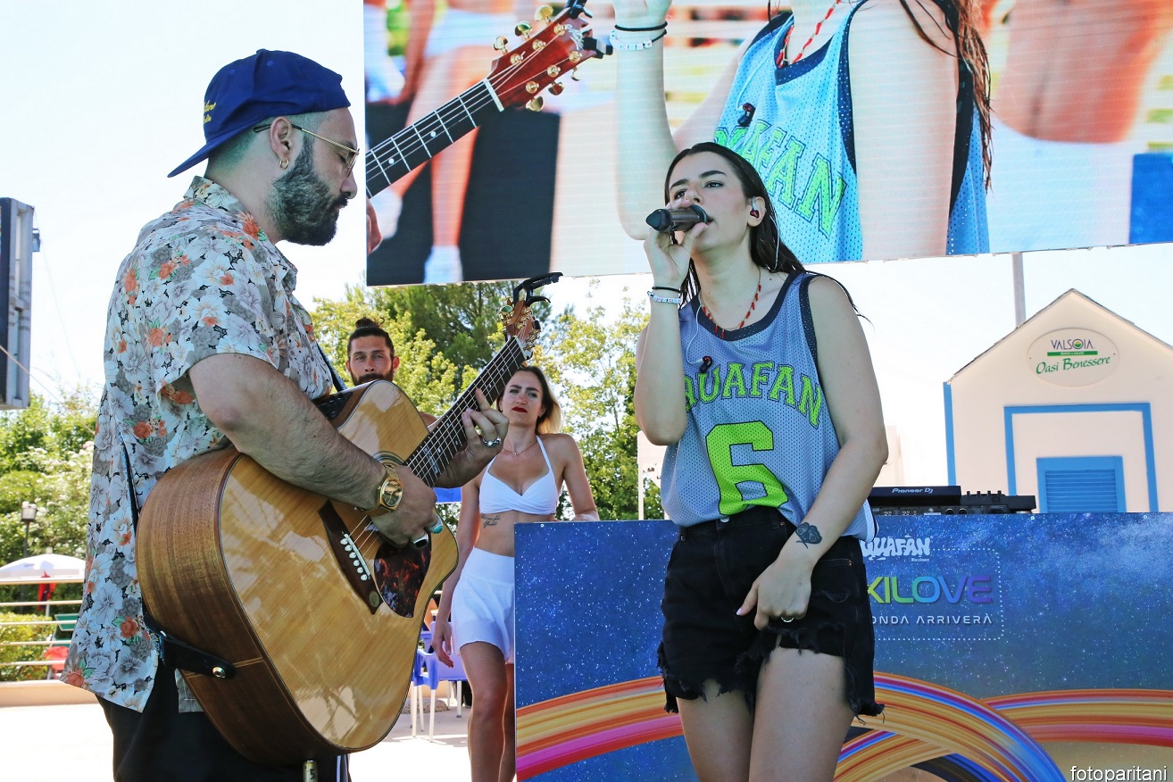 Federica Carta ha salutato tutti dicendo: "Esibirsi da questo palcoscenico così particolare, con il pubblico in piscina, è qualcosa di unico. Grazie Aquafan, grazie Riccione".