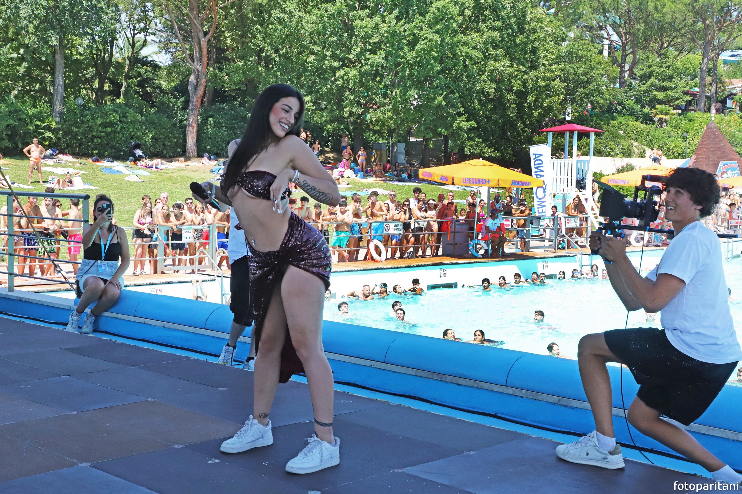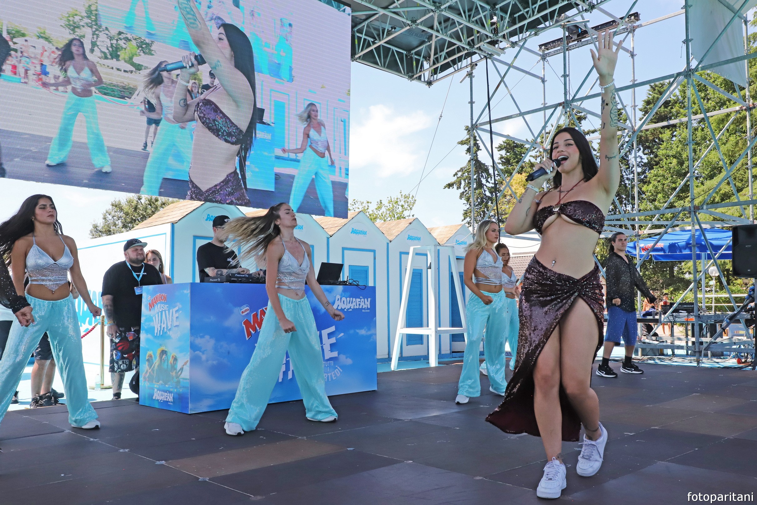 Con top e gonna in paillettes color rubino, la cantante tra le più promettenti della scena urban italiana, super sexy, ha presentato hit del passato e il suo ultimo tormentone ‘Calda’ con tanto di ‘doccia’ sul palco. La graffiante rapper, che registra milioni di streaming sui suoi canali social e Spotify, si è scatenata in compagnia degli Aquadancers.